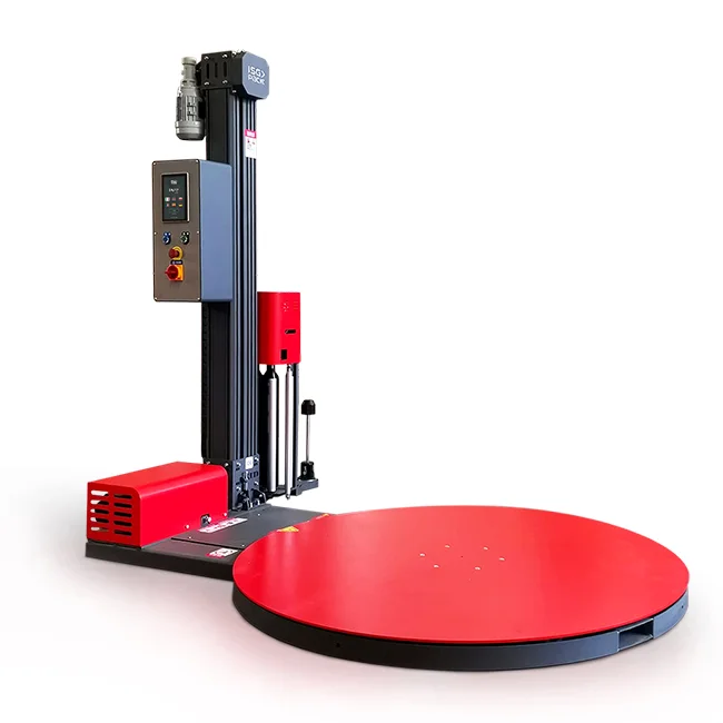 - Napędzany wstępny rozciąg folii (pre-stretch) – mniejsze zużycie folii, niższy koszt owinięcia palety, lepsza stabilizacja ładunku.