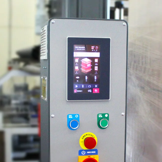 Maszynę można uruchamiać, zatrzymywać i resetować zarówno z poziomu panelu dotykowego, jak i fizycznymi przyciskami na pulpicie.